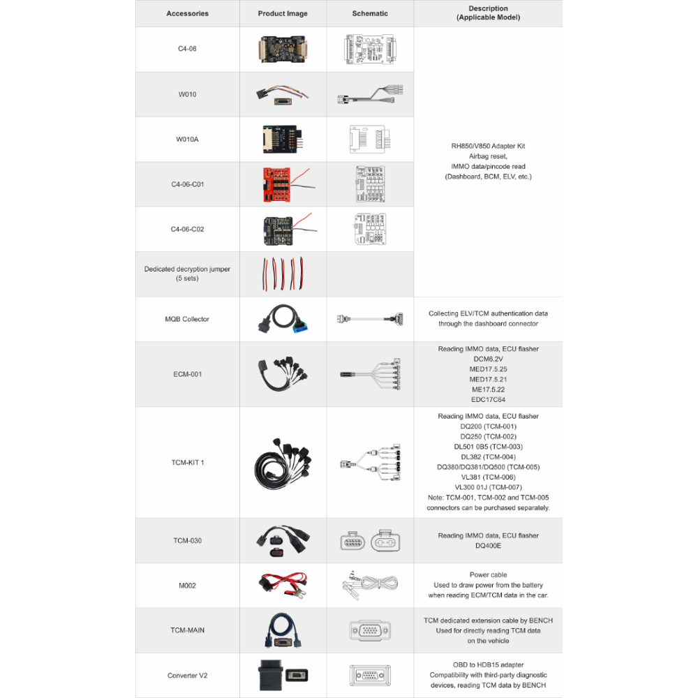 Полный набор адаптеров RH850 / V850 Adapter Full Kit включает в себя все адаптеры базового комплекта, а также дополнительные переходники MQB Collector для подключения к блокам двигателя и АКПП ECM001, TCM030, TCM-Kit. Все они предназначены для работы с платформой MQB и блоками подушек безопасности SRS, TCM, ECM, вычитки и изменении данных иммобилайзера, считывании пин-кодов в блоках приборной панели, кузова BCM, замка ELV и других.