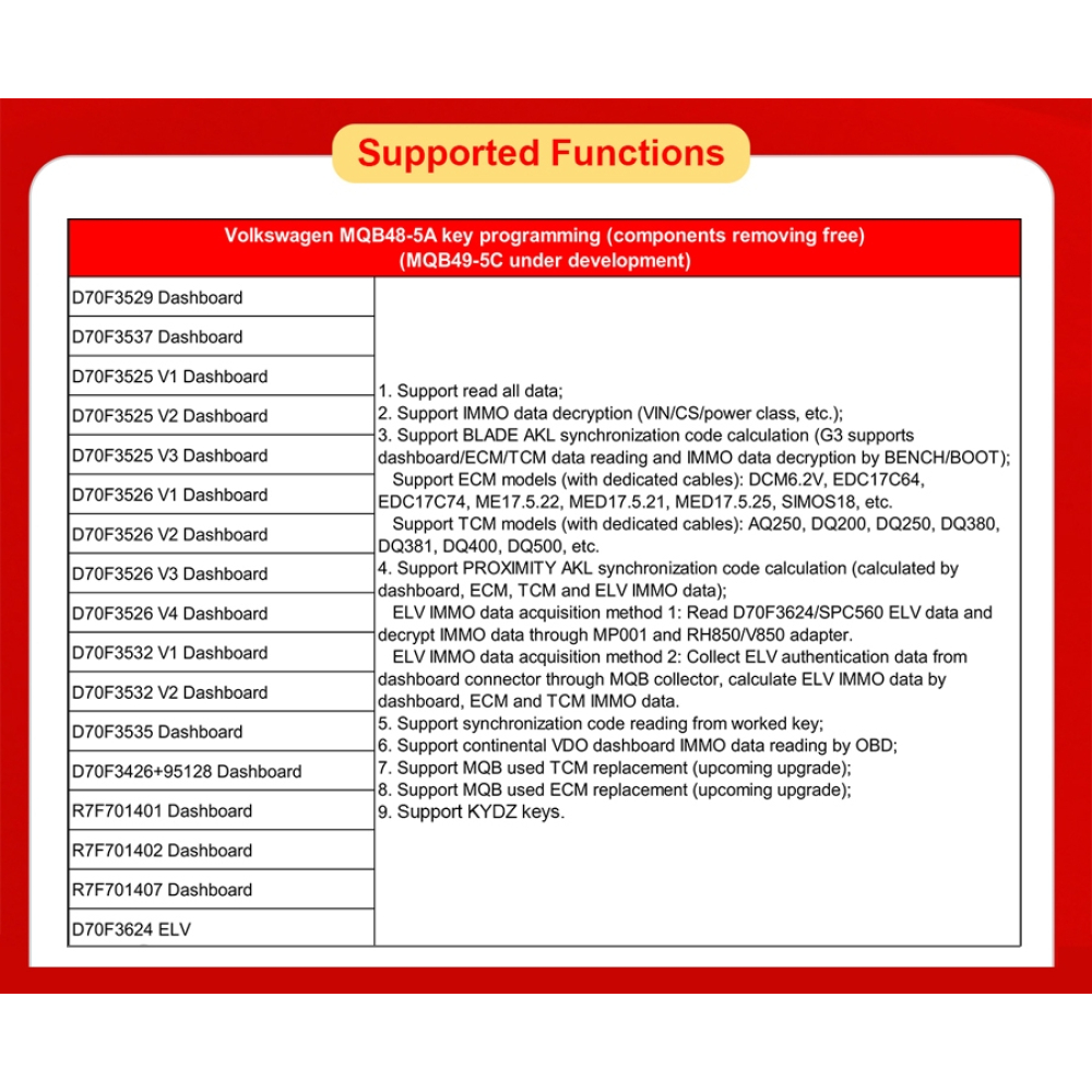 Примечание: Иногда требуется дополнительный модуль OBDSTAR MP001. Функции MQB AKL выполняются через серверный расчёт; ограничение — до 3 расчётов в сутки.