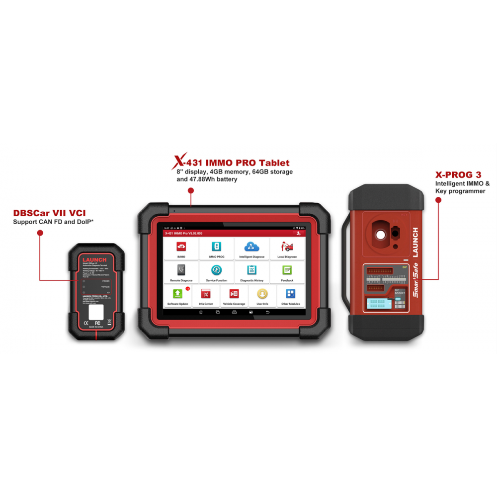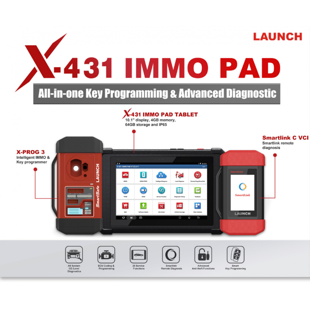LAUNCH X-431 IMMO PAD – новый мультимарочный сканер в премиум линейке диагностического оборудования от компании Launch. Работает на базе мощного Android планшета c диагональю 10.1” c 8 ядерным процессором Qualcomm 2.0GHZ, 64 Гб памяти и поддержкой быстрой зарядки QC3.0. Подключение к авто происходит через новый диагностический адаптер SmartLink, работающий практически со всеми протоколами и способен делать онлайн программирование по протоколу J2534. Для программирования ключей в комплекте поставляется программатор Launch X-PROG 3.